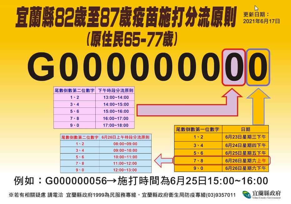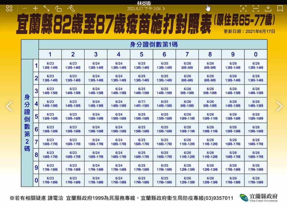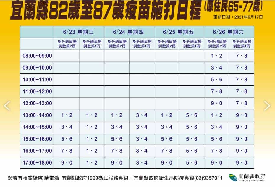 中央撥補9千劑疫苗 82到87歲長者將接續接種 Posted on2021-06-17Autor北台灣新聞網留下足跡 【北台灣新聞中心】 因應中央撥補9千劑疫苗到宜蘭,縣府規劃為82歲至87歲(原民住65歲至77歲)長者提供疫苗接種服務。相關分流措施將比照上一波規定,衛生局呼籲,請民眾留意身分證號碼,最後一碼對應注射日期、尾數倒數第二碼對應注射時段 。民政系統的村、里幹事會陸續發放施打疫苗通知單,民眾如有問題,可再接到通知單後,向所屬的鄉鎮市衛生所詢問。而衛生局也再次提醒,目前沒有開放民眾自主預約接種疫苗,請大家配合縣府相關規畫期程及順序,多加體諒與配合。 分享此文:FacebookTwitterPinterestPocket