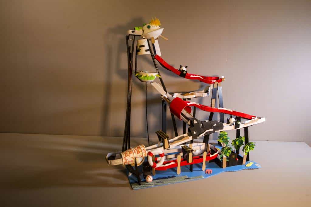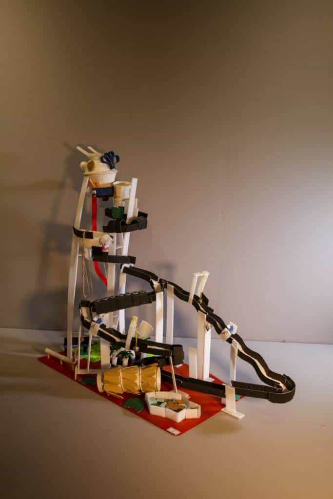 - 遊藝園:以雲霄飛車為主題,運用紙材做軌道,發泡棉、吸管、保麗龍球、鐵片等媒材,集體創作創意發想。