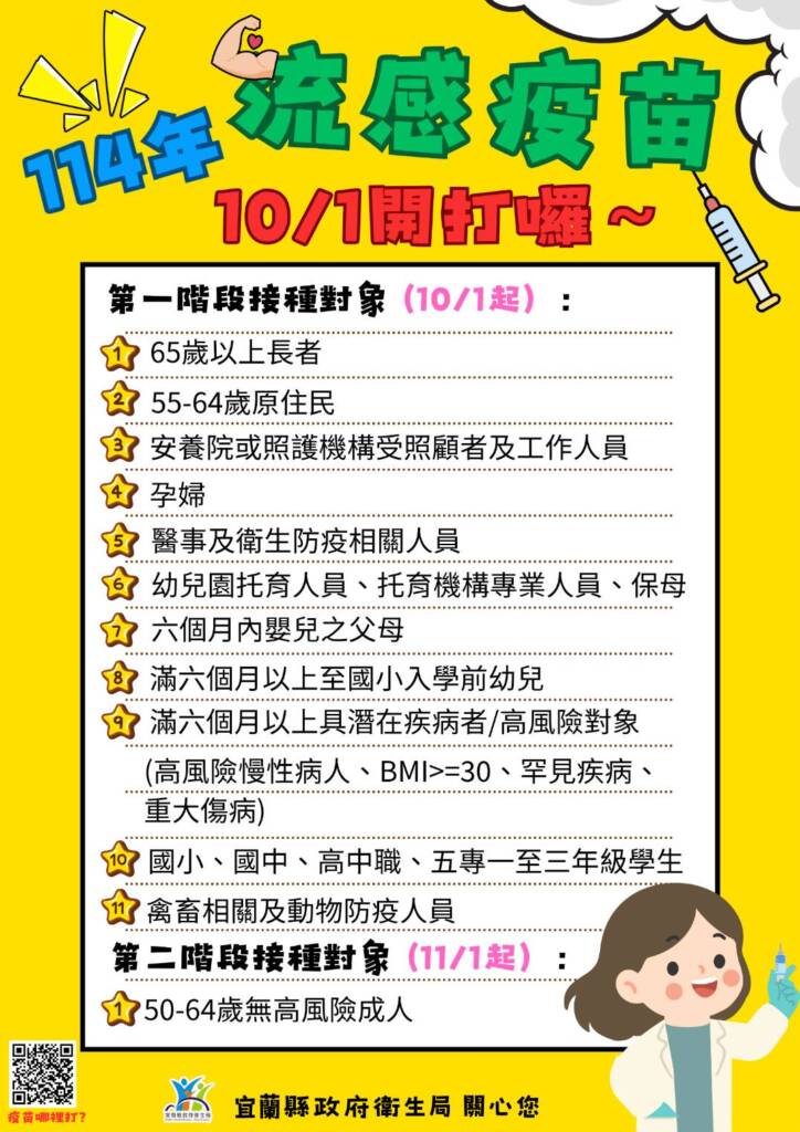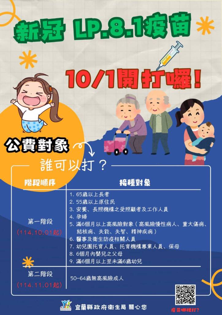 另外,公費流感及新冠LP.8.1疫苗已於10月1日起分二階段全面開打,第一階段施打對象包括65歲以上長者、安養及長照機構受照顧者及所屬工作人員、高風險慢性病人、孕婦、6個月內嬰兒之父母、幼兒園托育人員和托育機構專業人員及居家托育人員、滿6個月以上至學齡前幼兒及國小、國中、高中、五專1至3年級學生、醫事及衛生防疫相關人員、以及禽畜相關及動物防疫相關人員等;而第二階段將自11月1日起,開放50至64歲無高風險慢性病之成人接受疫苗注射。