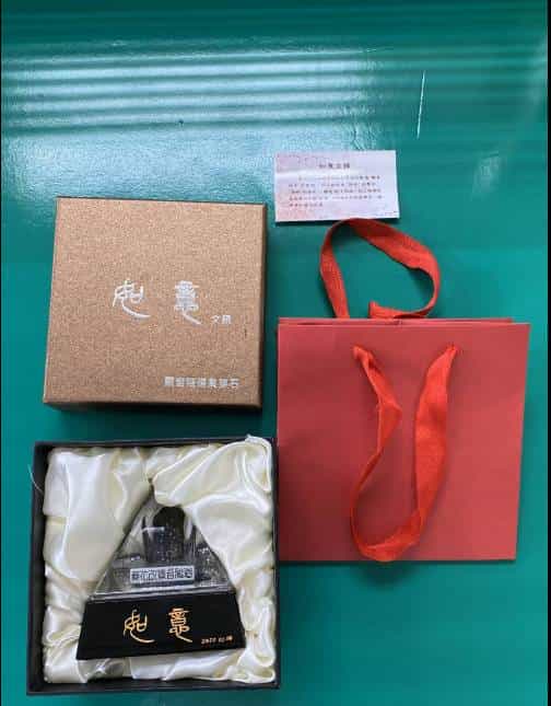 四、如意文鎮-觀音隧道貫通石:蘇花改工程觀音隧道的貫通石象徵「觀音送子」的意涵,所以被視為「助孕」的幫手、「招財」的推手、「鎮宅」的吉祥物,底座上烙印著宜蘭名書法家林鈺雰所書寫的如意,代表我們希望帶來一個事事如意的好運。