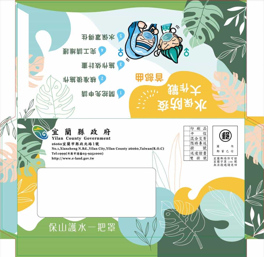 防疫期間為使民眾可以在家一起推廣水土保持,縣府首次將制式之公文信封導入水土保持元素加以設計,主題訂為水保防疫大作戰。首部曲:保山護水一把罩,並以簡單的5個步驟:1.開挖先申請,2.核准後施作,3.施作依計畫,4.完工請維護,5.水保罩得住,提醒民眾防疫期間,也要保山護水,牢記5步驟,水保一把罩。