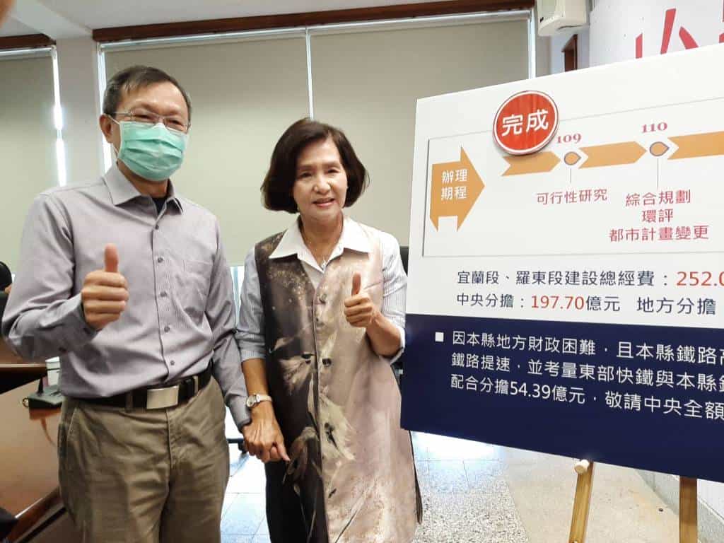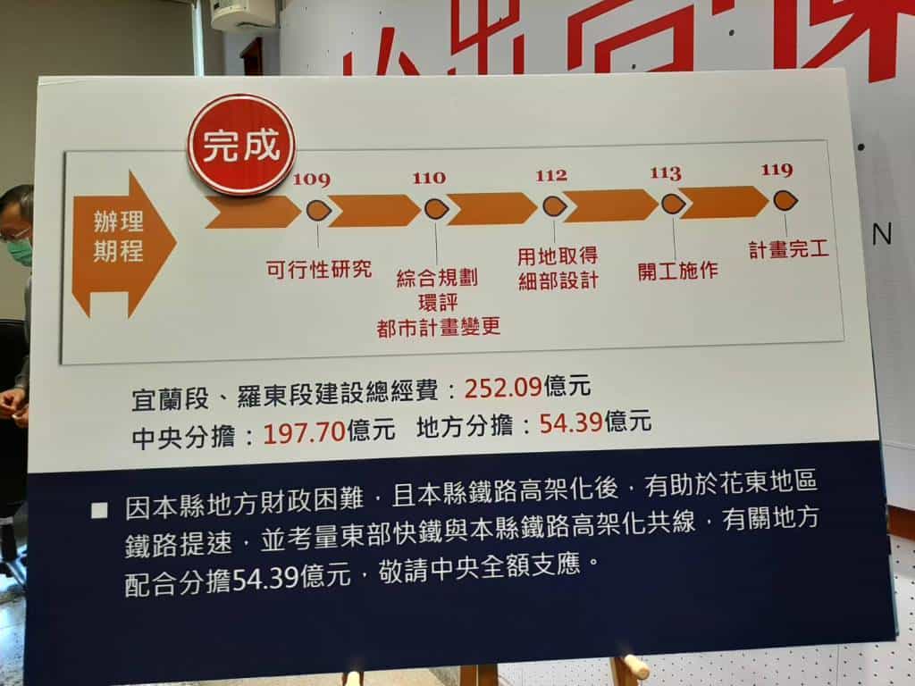 宜蘭鐵路高架化計畫,縣府自97年至108年歷經5次送交通部審查,交通部於109年5月21日陳報行政院,歷經12年,終於在昨(26)天正式核定。未來交通部將併同北宜直鐵、高鐵及東部快鐵整體規劃,宜蘭將成為東部交通運輸門戶及樞紐。據此,考量本縣地方財政困難,有關地方配合分擔54.39億元,縣府將協請行政院公共工程委員會及交通部依照蘇院長現地視察裁示降低宜蘭縣府負擔比例。