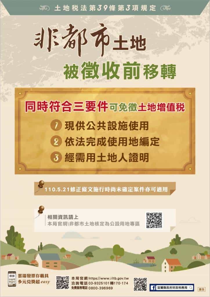 財政稅務局說明,為落實「供公共設施使用之非都市土地」與「都市計畫指定之公設保留地」於徵收前移轉時,徵免土地增值稅之公平性,財政部於今(110)623日修正公布土地稅法第39條第3項規定,非都市土地經需用土地人開闢完成或依計畫核定供公共設施使用,並依法完成使用地編定,其尚未被徵收前之移轉,經需用土地人證明者,免徵土地增值稅。同時,為利徵納雙方及需用土地人發證作業有所依循,財政部並依同條第4項授權規定,會銜內政部於812日發布「非都市土地供公共設施使用認定及核發證明辦法」。