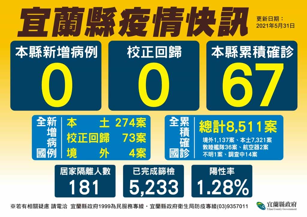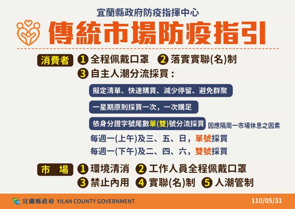 宜蘭今(31)日無新增個案,但林姿妙縣長提醒,疫情嚴峻民眾仍不可掉以輕心。考量近日多起確診案例疫調足跡皆涉傳統市場,林縣長呼籲縣民外出採買務必小心,並公布「傳統市場防疫指引」,希望民眾能夠自主依身分證字號尾數進行分流、一次購足需要的物資等,減少群聚及交互感染風險。