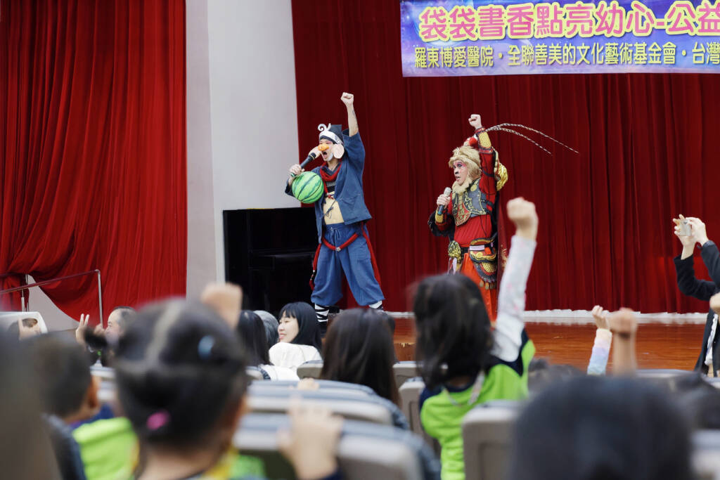 現場特別邀請宜蘭傳藝園區熱門駐園大戲《齊天大聖嬉遊記》演員走入校園演出,讓孩子們在戲劇中體驗故事魅力。活動現場書袋整齊排列、孩子們專注聆聽演出,展現醫療、教育與文化攜手合作所帶來的溫暖成果。