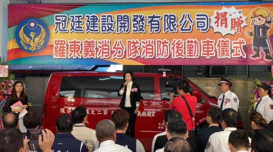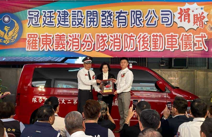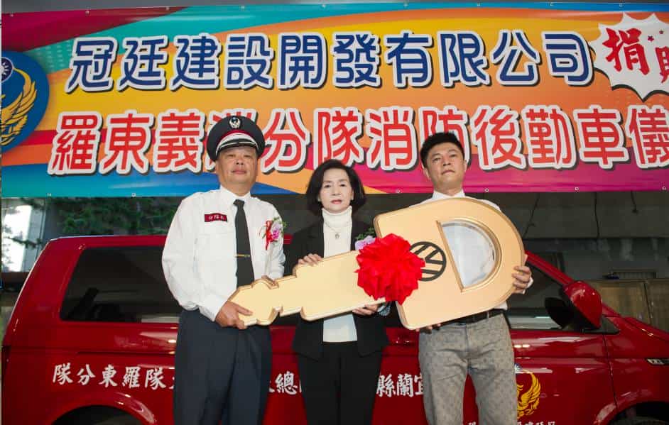 冠廷建設是羅東在地公司,創立宗旨秉持著從宜蘭出發,尋 找最好地點,蓋最好建築,將美學融入建築,將質感融入生活,打造最好的居住環境,是在地生根、在地認可、在地信賴的最佳居住服務提供團隊,更以「慈善福利社會」實踐為己任,持續在宜蘭及各界捐贈各種物資,讓愛心的傳遞無遠弗屆並深入每個角落。因此特別捐贈羅東義消分隊消防後勤車乙輛,期望能為長年於災難現場 衝鋒陷陣的義消人員,提供執行勤務時的助力,並福利社會大眾,傳播善心。