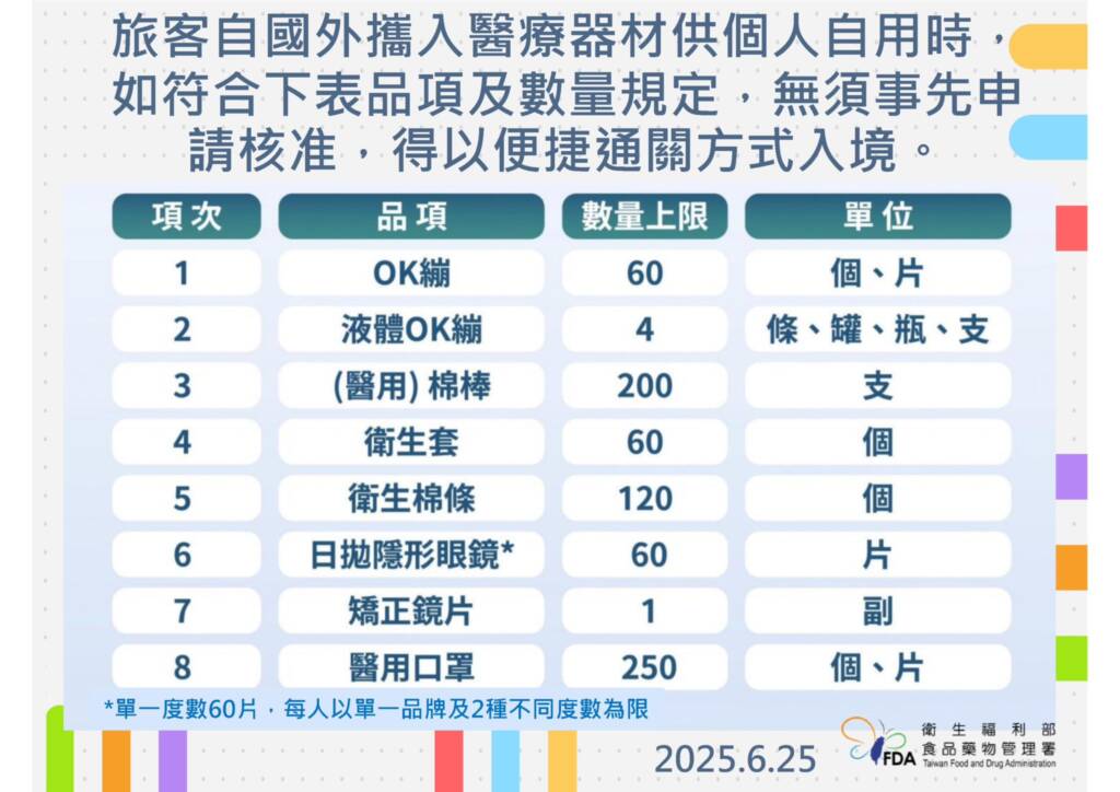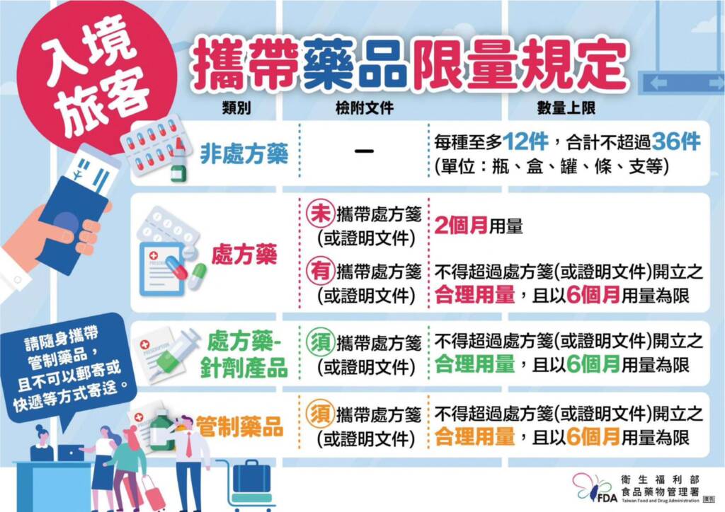 攜帶非處方藥品每種最多12瓶,合計不超過36瓶;處方藥品最多6個月用量,且應附醫師處方箋(或證明文件)。攜帶醫療器材上限為OK繃60個(片)、液體OK繃4條(罐、瓶、支)、(醫用)棉棒200支、衛生套60個、日拋隱形眼鏡60片(單一度數60片,每人以單一品牌及2種不同度數為限)、矯正鏡片1副、衛生棉條120個、醫用口罩250個(片)。如果民眾攜帶此類產品的數量超過限量,或其他非屬限量可攜帶入境之醫療器材,則須申請輸入許可,並向海關申報。