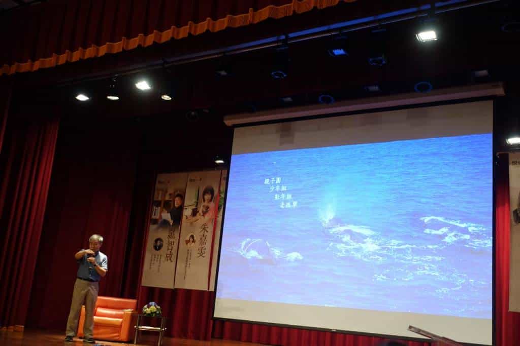 作家渡也朗讀詩作〈花蓮跟著我們回來了〉:晚上洗澡,幾隻抹香鯨在浴缸裡游泳,充滿想像的3D概念趣味,讓常在太平洋與大群鯨豚相處,書寫〈遇見花小香〉等海洋文學的廖鴻基作家打趣地回應「浴缸太小,是容不下抹香鯨的龐大身軀」,廖鴻基說「海洋無法預約,但可以期待」。