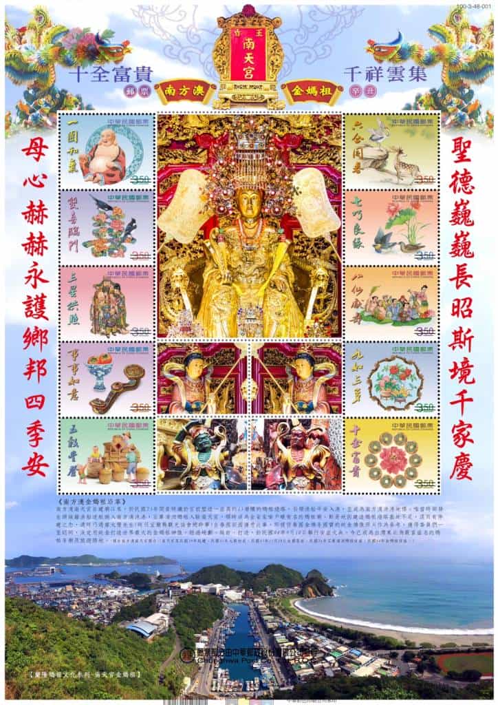 該局嚴洧澤局長表示,感謝蘇澳南方澳南天宮陳主委的鼎力相助,得以有機會製作這一組神威顯赫、慈善莊嚴、獨一無二的媽祖郵票供國人典藏,除可暸解蘭陽平原南方澳的歷史及南天宮金媽祖興盛的典故外,祈望帶給國人信眾虔誠收藏,平安順利,事事順興。此次發行限量2000組,歡迎虔誠信仰媽祖信眾及一般愛郵顧客踴躍向宜蘭縣各地郵局訂購。
