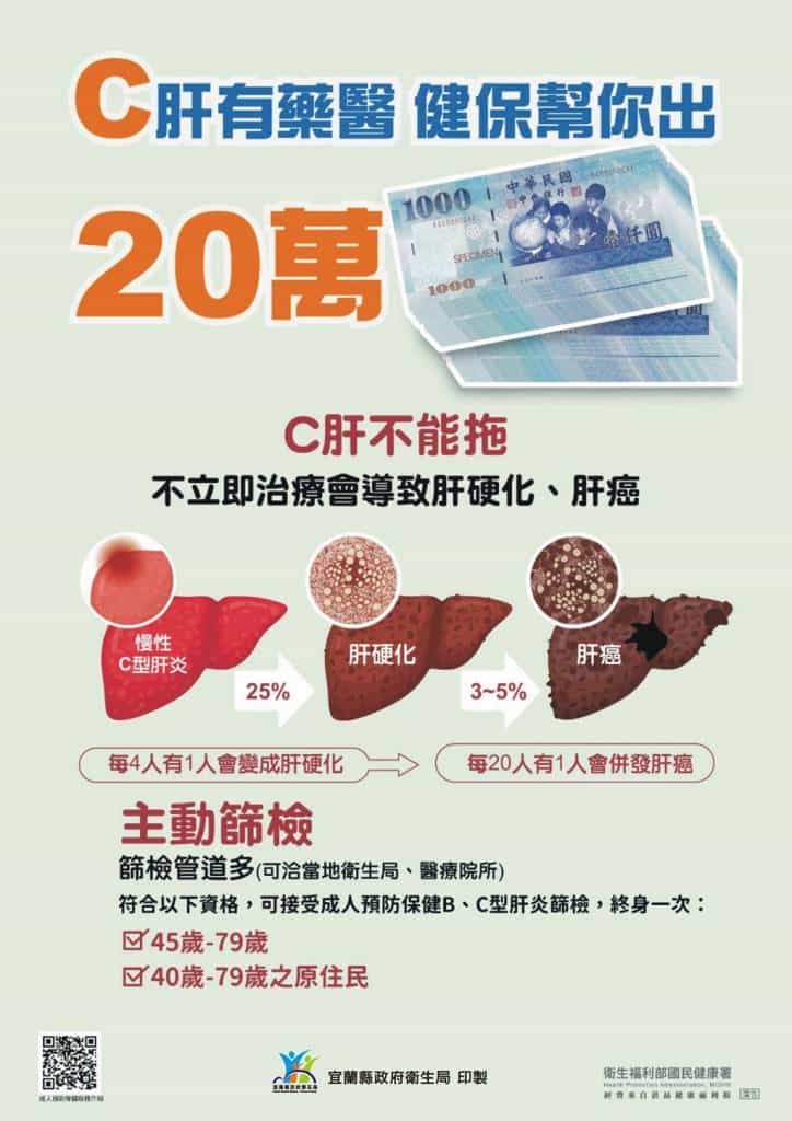 為讓更多民眾知道自己是否罹患B、C型肝炎,並及早接受治療,衛生福利部自109年9月28日擴大成人預防保健B、C型肝炎篩檢服務,年齡為45至79歲之民眾(原住民朋友則為40至79歲),終身可接受1次免費篩檢服務。