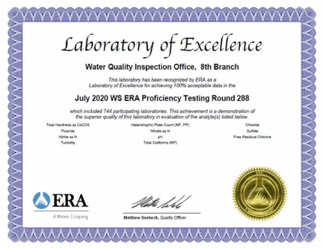 為確保水質檢驗之檢測水準,每年定期參加美國檢驗分析能力試驗機構 (Environmental Resource Associat es,Inc.)(ERA)所舉辦之能力測試,測試的內 容主要是藉由國際間不同檢驗單位的檢驗數據比對分析,驗證檢驗數據的準確 度,在該測試中台水八區處實驗室受測的認證水質檢驗項目皆通過,足以證明實 驗室檢驗能力符合國際認證等級。