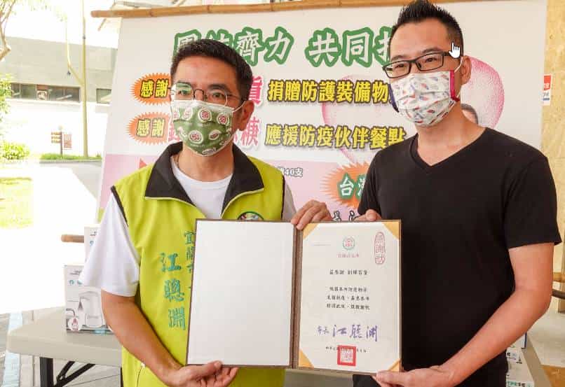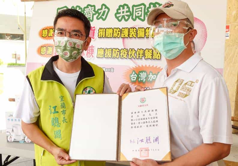 本土疫情雖然略有降溫,但是防疫工作時時刻刻皆須嚴陣以待,眼見公部門個人防護用品需求殷切,創輝百貨特別捐贈防護面罩、消毒噴霧水槍、防護手套等物資給宜蘭市公所,希望成為守護前線人員安全的堅強後盾,市長江聰淵也特別頒贈感謝狀表揚,肯定民間力量攜手公部門共同抗疫,此外,宜蘭市知名美食鋒木魚酥焿也免費捐贈200份餐券給市公所,希望幫辛苦的第一線同仁加油打氣。