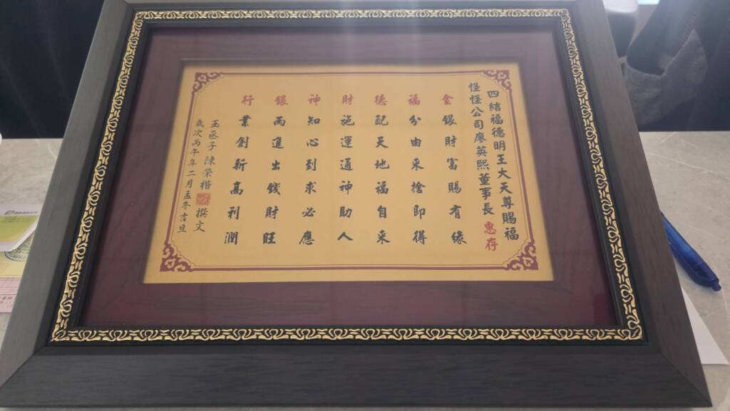 (下圖-文史工作者陳榮楷贈送“福德明王大天尊”賜福,“金福德財神銀行”藏頭文給有緣善信)