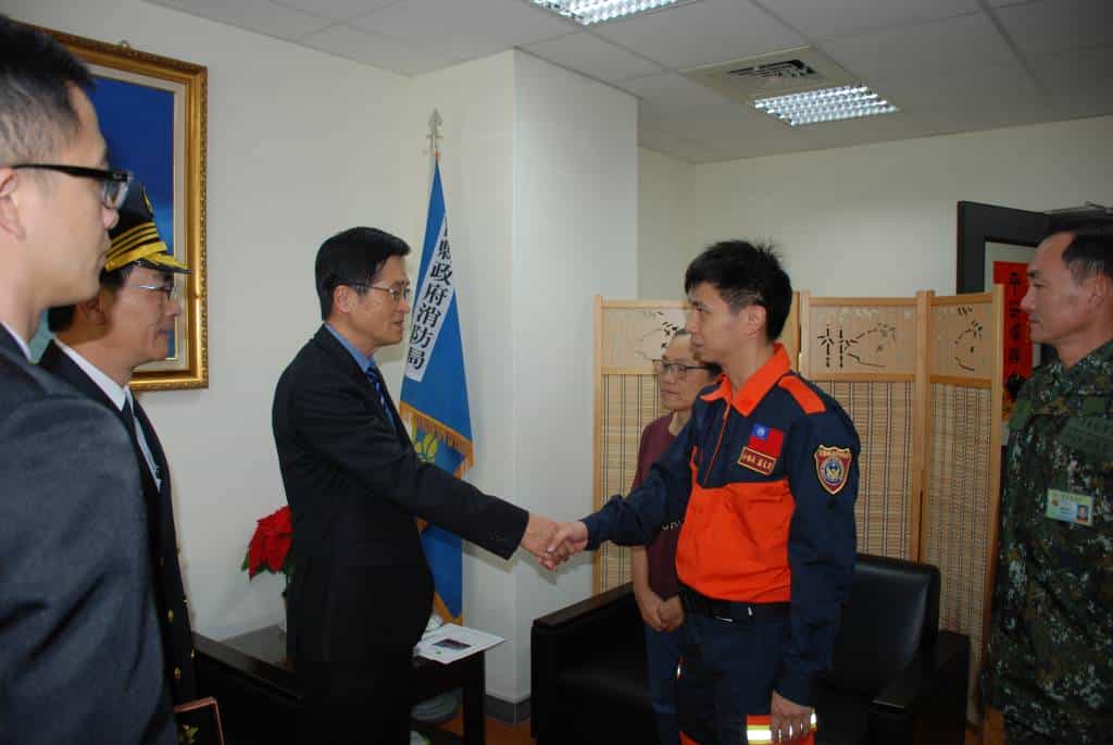 黑鷹直升機1月2日迫降北宜山區,造成8死5傷重大事件,宜蘭縣政府消防局團隊救援迅速得力,國防部嚴德發部長,今天(6日)上午親自率領空軍副總長李延盛中將、六軍團指揮官楊基榮中將等人,到宜蘭縣政府消防局表達慰勉之意,嚴部長感謝所有救災人員克服地形困難,發揮災害搶救能力,並肯定消防局科員陳秋霞對於救災路徑的正確判斷,縮短救援時間,功不可沒。會上嚴部長親贈加菜金及水果禮盒給宜蘭縣政府消防局,更贈送特種分隊分隊長藍文宏、消防局陳秋霞手錶一隻,期勉救災人員分秒必爭,搶得先機。