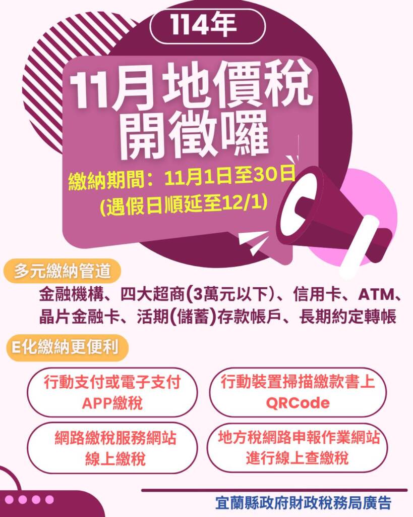 宜蘭縣政府財政稅務局表示,今年(114)地價稅將於111日至30日開徵,每年831日為地價稅的「納稅義務基準日」,只要您是114831日土地登記簿上所記載的土地所有權人或典權人,即為114年收受地價稅單的納稅義務人,本縣地價稅稅單已委託郵局於1023日起陸續寄發。