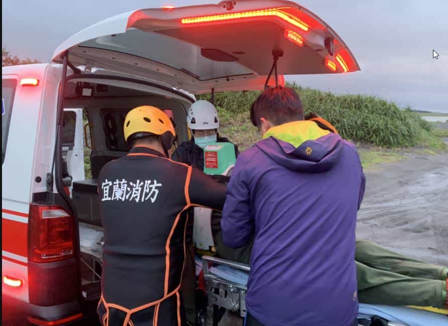 壯圍鄉蘭陽溪出海口12/03下午 1554有捕鰻民眾遭浪沖走,目前該民眾有穿著救生衣於海面上載浮載沉,宜蘭縣政府消防局接獲民眾報案請求派員前往救援。1646時於距清水端往南300公尺處待救民眾遭浪打上岸,患者無生命徵象,現場施予CPR急救中,預計將患者送往聖母醫院。