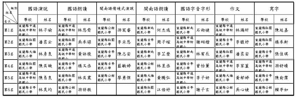 今(110)年度語文競賽參賽員為壯圍鄉國小所推派之語文優秀學生。競賽項目及參與學生人數為:國語演說6名、閩南語情境式演說6名、國語朗讀10名、閩南語朗讀10名、國語字音字形13名、作文9名及寫字(書法)8名。