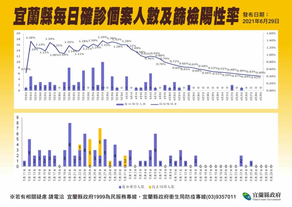 宜蘭今(29)日無新增個案。縣長林姿妙表示,宜蘭雖然連續4天無新增案例,但外縣市疫情仍然嚴峻,請民眾務必落實相關防疫作為,保障自己、社區和社會安全。另縣府已於昨(28)日完成大溪漁市場的篩檢工作,共檢測236位,結果皆為陰性。