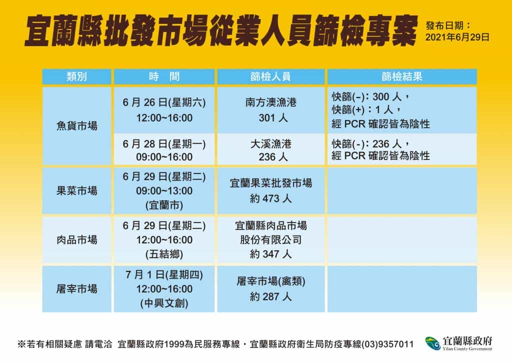 縣府表示,為確保各批發市場、肉品市場及漁市場工作人員的健康安全,陸續進行全面快篩及核酸檢測作業。6月26日完成南方澳漁市場篩檢工作,301人全為陰性;而昨(28)日在大溪漁市場進行篩檢,共檢測236位,結果皆為陰性,請縣民放心。
