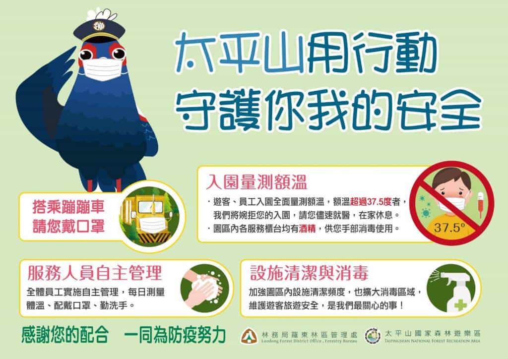因應新冠病毒疫情再度升高,中央流行疫情指揮中心自5月11日下午2時起至6月8日,提升疫情警戒至第二級,太平山國家森林遊樂區除了加強各據點環境的消毒工作外,配合全國防疫工作自110年5月11日下午3時起實施以下各項措施:
