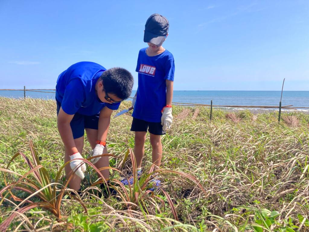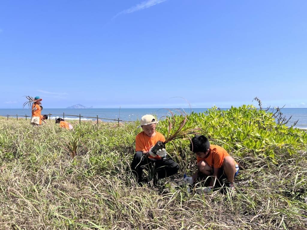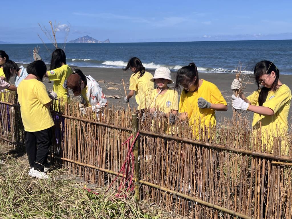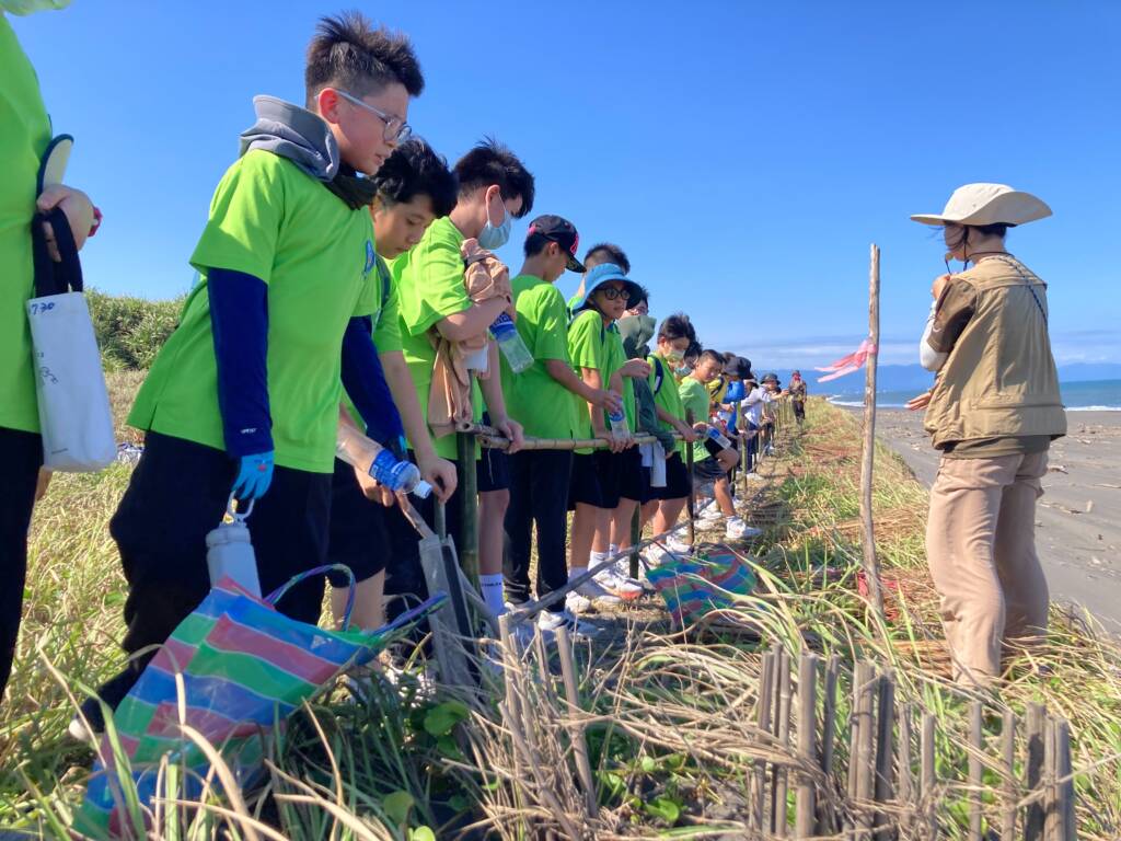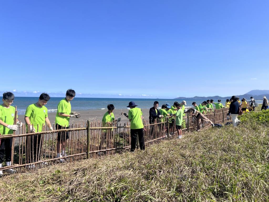 活動內容分為導覽與實作兩部分進行,師生們在導覽中認識保安林的功能與海岸防護機制,隨後在環境教育教師指導下實作。國中學生負責堆砂籬搭設,運用鉛線鉤結合竹竿與竹樁,合力架設出一段段整齊堅固的防砂設施;國小學生則投入林投種植任務,於堆砂籬後方栽植幼苗,串聯形成海岸林與沙丘之間的綠色廊道。透過親身參與與團隊合作,學生們不僅深化對海岸保育的認識,也培養了環境責任感。