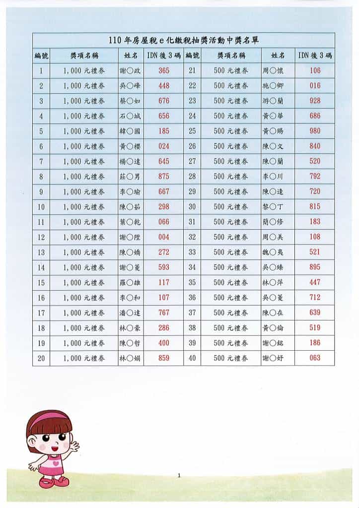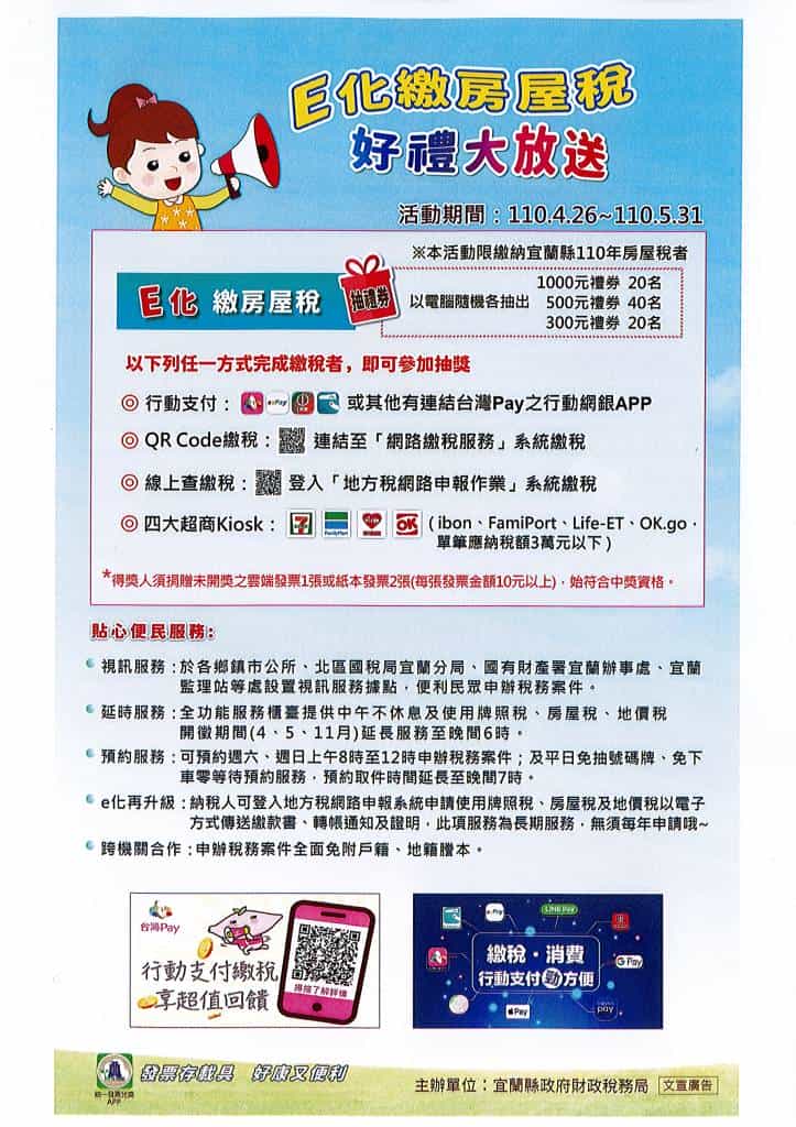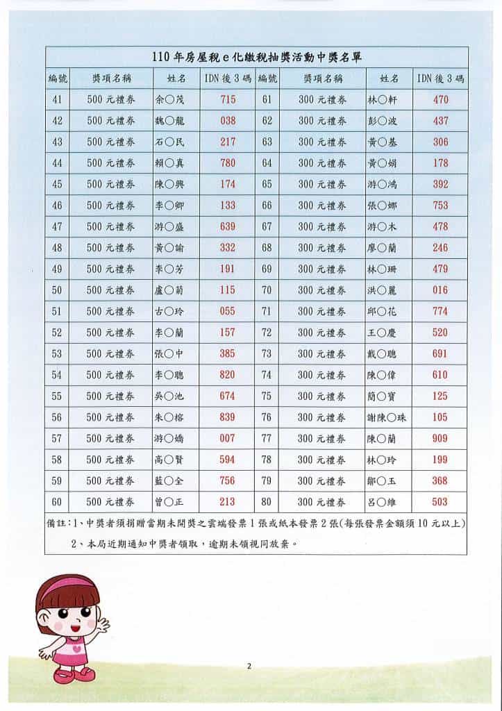 次活動抽出1,000元禮券20名、500元禮券40名及300元禮劵20名,財政稅務局近期內以掛號通知中獎人,請中獎人於本(110)年8月31日前憑身分證明文件及雲端發票1張或紙本發票2張向該局領取,逾期視同放棄。中獎名單亦可上該局網站(www.iltb.gov.tw)或FB粉絲專頁查詢。