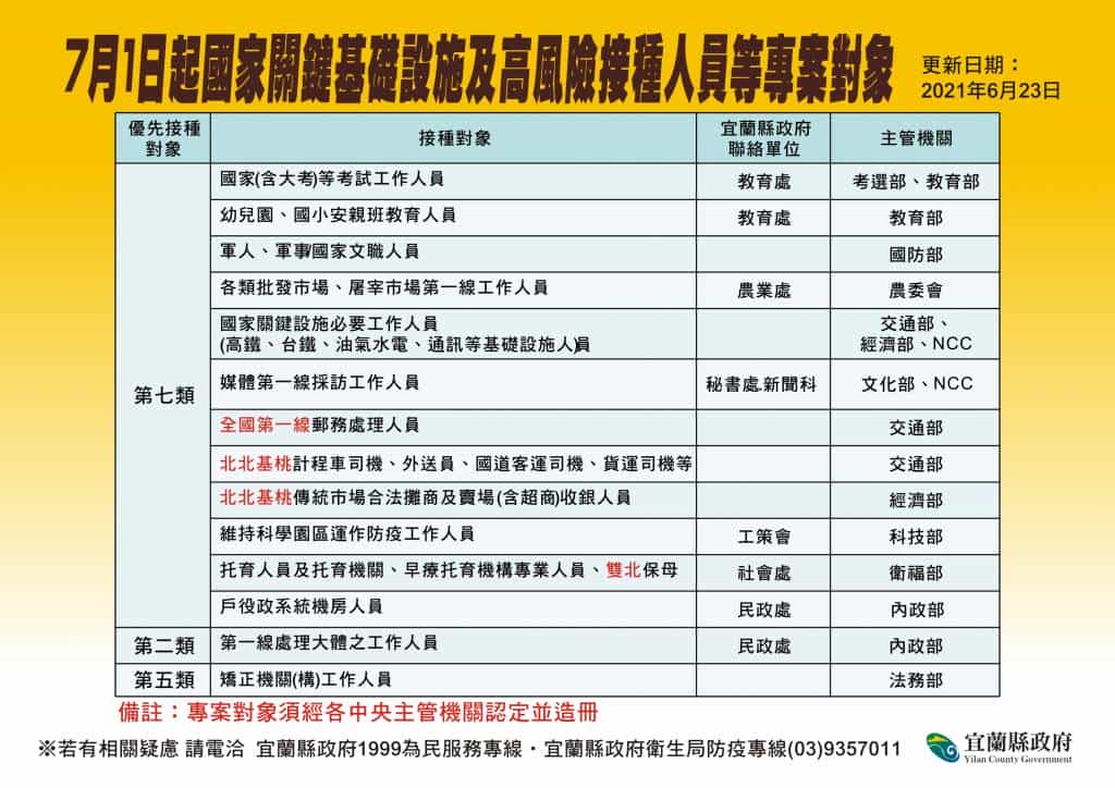 另外,指揮中心昨(22)日宣布,自7月1日起擴增國內COVID-19疫苗接種對象。為維持國家及社會相關基礎設施正常運作,第七類對象需經各中央主管機關認定及造冊,列為國家關鍵設施或維持設社會正常運作必要的工作人員,送指揮中心同意後實施。縣府指出,請符合第七類族群及接種的對象,由各主管機關造冊後,提送中央主管機關認定。