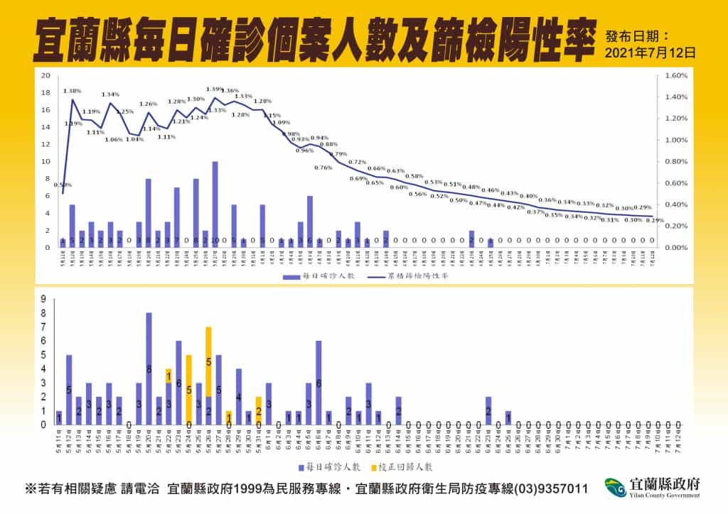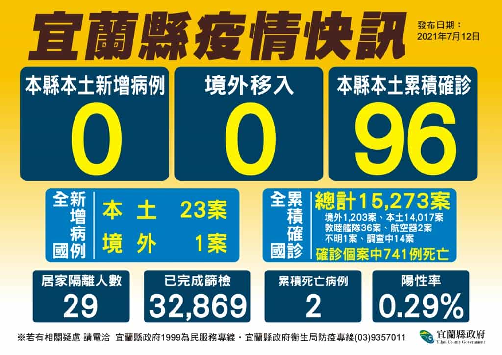 宜蘭今(12)日無新增個案。縣長林姿妙表示,依據中央統 計數據,截至7月11日止,本縣疫苗接種率在全國排行第五,完成接種率為70.07%。