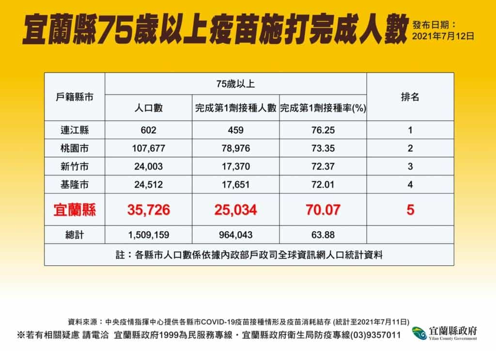 據中央提供各縣市COVID-19疫苗接種情形報表,截至7月11日止,宜蘭縣75歲以上完成第1劑接種人數共計2萬503人,完成接種率為70.07%,在全國各縣市排名第五位。