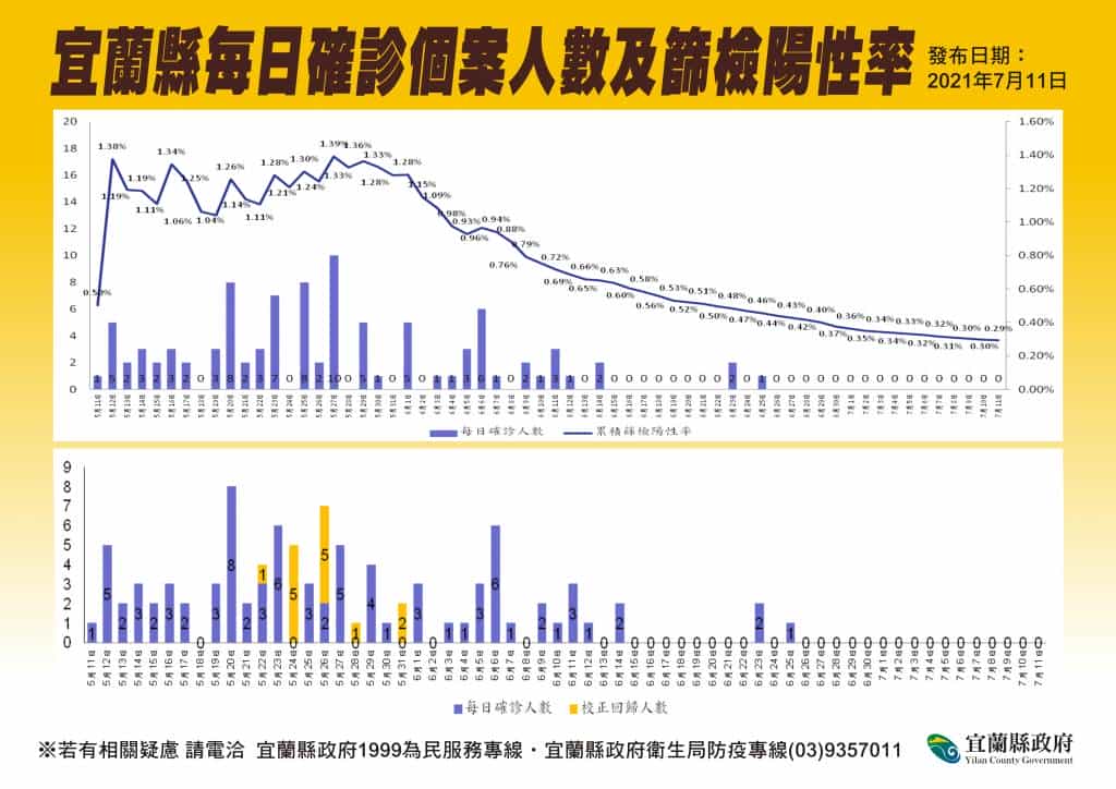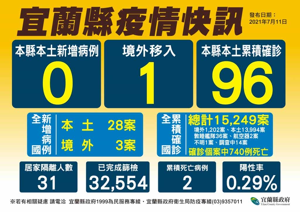 宜蘭今(11)日無本土確診個案,惟有1名境外移入個案。此人在本縣沒有足跡,也無匡列相關接觸者。