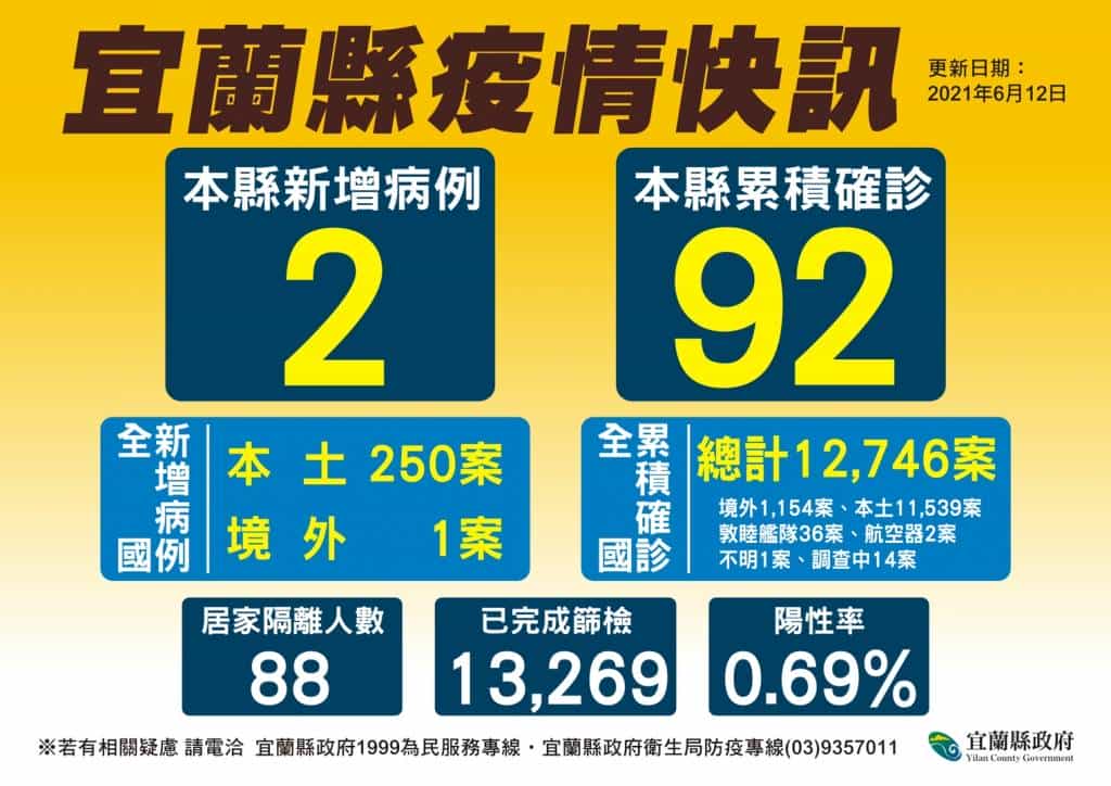 宜蘭今(12)日新增2例個案 目前累計92例2例