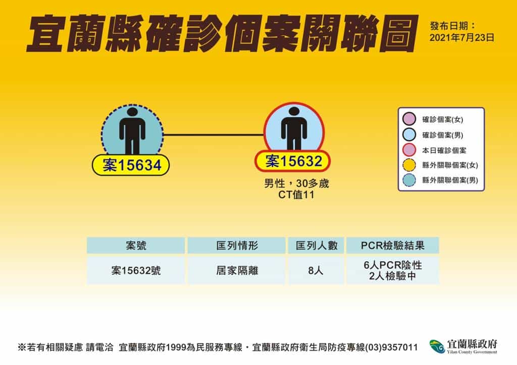 縣政府表示,案15632為30多歲男性,曾於7月16日自行開車到台北與朋友敘舊,7月21日上午出現喉嚨痛、鼻塞、流鼻水、輕微發燒、腰痠背痛等症狀。後又接獲通知台北友人的朋友確診,案15632就自行前往便利商店購買家用快篩試劑,快篩結果為陽性。隨後自行至醫院急診做PCR篩檢,結果為陽性而確診,CT值11。