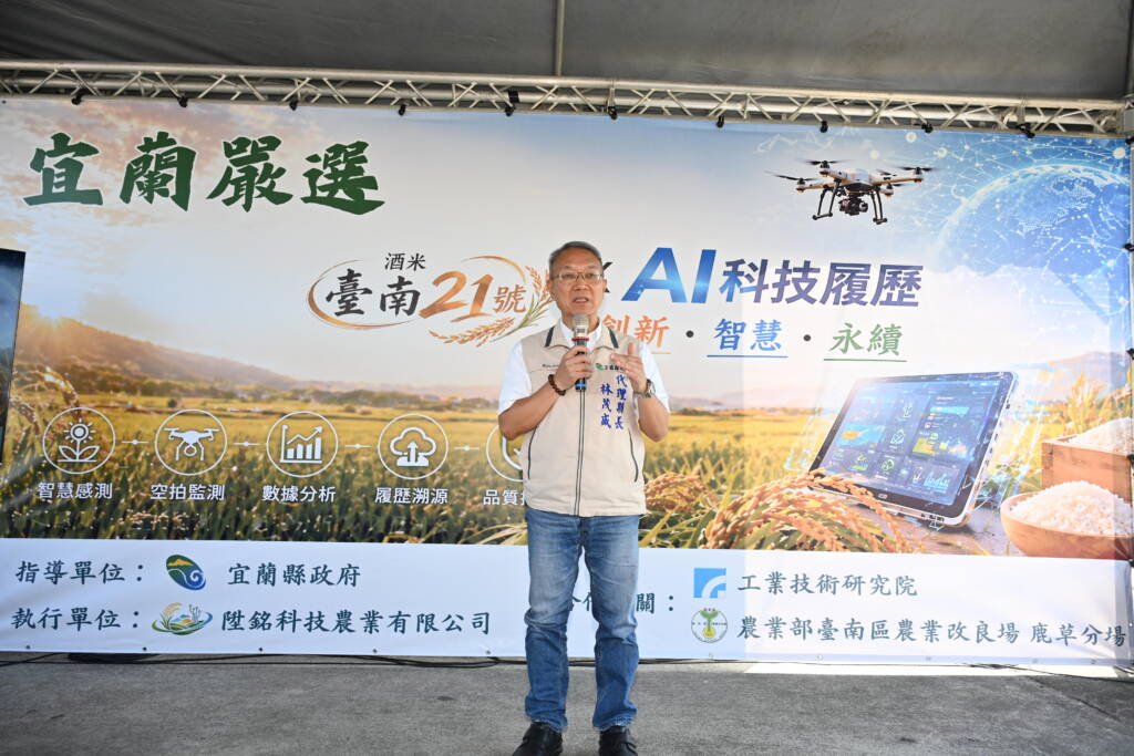 宜蘭縣政府推動農業升級,首度導入清酒釀造專用酒米品種「臺南21號-南藏」,並於壯圍鄉設立試驗田區,邁出進軍清酒市場的重要一步。今(26)日於試驗田區舉行揭牌儀式,由代理縣長林茂盛出席,攜手農業部臺南區農業改良場、工業技術研究院及在地契作團隊,共同啟動「酒米 × AI智慧農業」合作計畫。