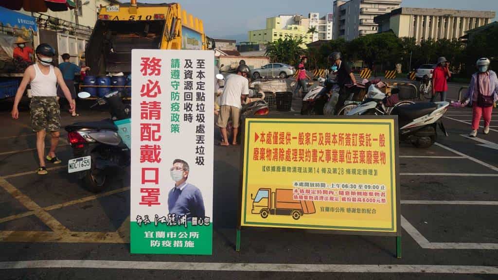 自上週宜蘭縣出現首例武漢肺炎確診者後,全台疫情隨著宜蘭遊藝場群聚事件的疫調逐漸蔓延,宜蘭市公所除了立即配合中央疫情指揮中心的要求,進行各項場館封閉及活動取消等的防疫作為外,同時主動對社區、人潮聚集處及轄內21處學校及幼兒園等進行消毒作業;面對越演越烈疫情蔓延以及宜蘭市區越來越多的確診者足跡,宜蘭市長江聰淵稍早宣布:「即日起,針對每日上午宜蘭市公所後方的垃圾定點清運處,嚴格執行未配戴口罩者不得進場,該處同時也請宜蘭分局的員警支援進行相關管制作業,每日下午沿路進行的家戶垃圾收運作業,也將從今天開始,配合政府提升全國防疫層級至第三級,規範民眾外出均需配戴口罩,即日起拒絕收運未配戴口罩民眾的垃圾及資源回收。」