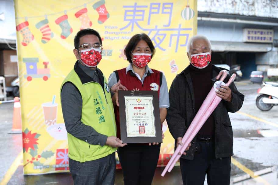 宜蘭市公所與宜蘭東門夜市攜手送暖,延續「光棍不單身」活動的消費抵用券熱潮,特別為宜蘭縣自閉症協會與宜蘭縣曙光關懷協會,各提供600張30元抵用券,今(12/8)日由自閉症協會理事長陳惠玲與曙光關懷協會理事長林鎮安代表,以交換禮物的形式表達感謝。
