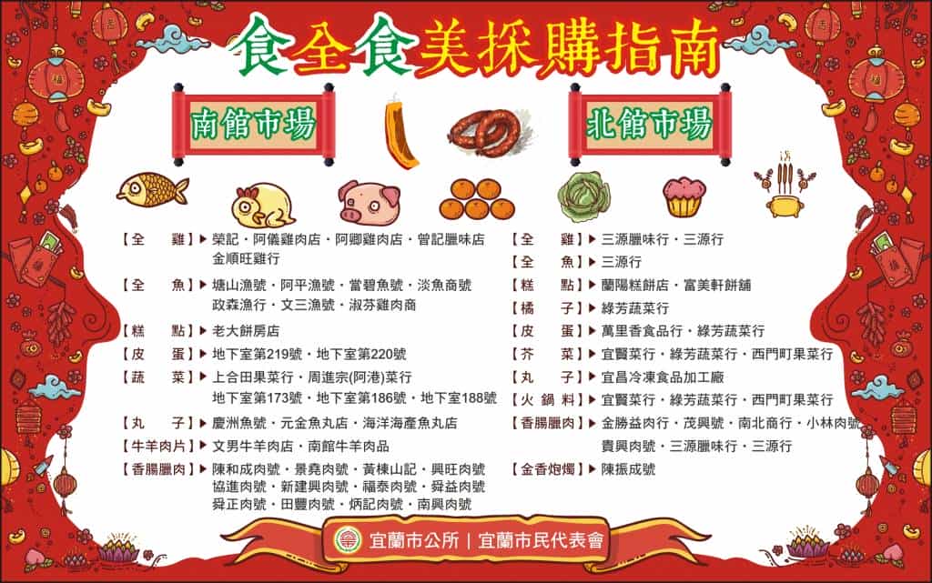 宜蘭市長江聰淵表示,今年市公所提供「美食採購指南」,建議大家如何選配年菜與了解其意涵,像是年糕象徵「步步高昇」、魚則是「年年有餘」、長年菜象徵「延年長壽」、水餃是「金元寶」財源滾滾、發糕保佑財運「一路發」等,此外也幫市場除舊布新,用各種年節飾品妝點市場,讓民眾感染農曆新年的吉慶與歡樂。
