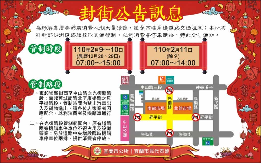 農曆新年即將到來,宜蘭市公所為了提供採買年貨民眾舒適、安全、便利的購物環境,宜蘭市南、北館市場周邊道路將於2月9日至2月11日除夕當天,每日上午7點至下午3點實施交通管制,除限制汽車進入外,並規劃機、踏車停車格,方便民眾購物。