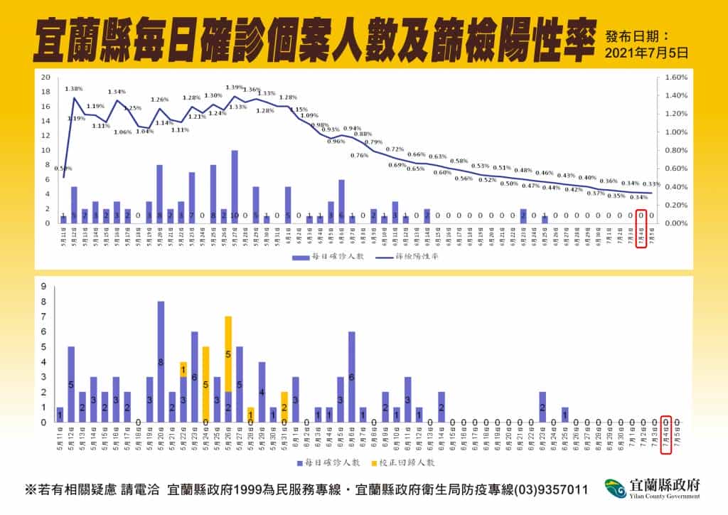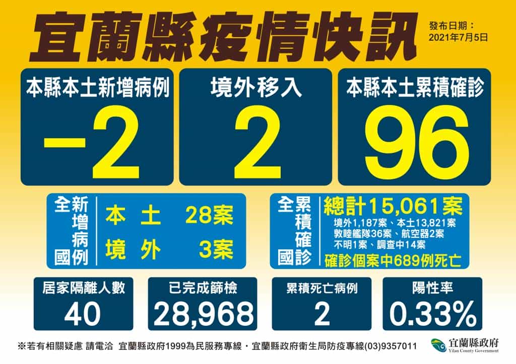 宜蘭今(5)日無新增個案,昨(4)日公布2位確診個案,經中央判定為境外移入個案,宜蘭縣累積本土確診個案降至96人。
