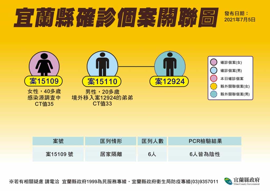 昨(4)日公布的案15109與案15110號,經過詳盡的疫調後發現,該2名個案都是從國外回來台灣,有的還曾和確診者接觸過。此次確診前均已在國內接受過多次篩檢,結果都是陰性。再者,此次確診後,周邊的接觸者檢驗全是陰性,並且個案CT值也偏高,經中央的防疫專家討論後,判定為境外移入個案,因此宜蘭縣累積北土確診個案減2,降至96人。
