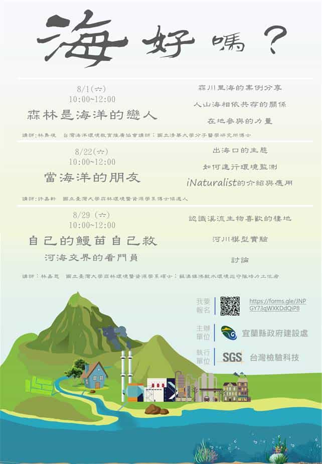 宜蘭縣位於臺灣東北角,海岸北起頭城鎮大澳,往南至和平溪口,海岸線總長約111公里。目前仍保有30餘公里之自然砂質海岸,實為彌足珍貴。宜蘭縣政府建設處積極向中央爭取經費來推動海洋環境保護及資源管理等相關工作。八月份以6個不同的主題在蘇澳鎮社會福利大樓及蘇澳鎮大坑罟大玄廟活動中心舉辦教育推廣活動。時間分別為8/1、8/16、8/19、8/22、8/23及8/29。