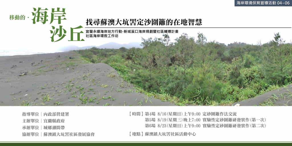 這次縣府以六個不同的主題舉辦推廣活動與社區居民同樂,8月1日【森林是海洋的戀人】分享森川里海的案例,人山海相依共存的關係。8月16日【定砂圍籬作法交流】邀請曾有手作定砂圍籬經驗的耆老,分享以往定砂圍籬的作法,了解定砂籬保護海岸沙丘的奧秘。8月19日【實驗性定砂圍籬研發實作(第一次)】透過耆老的回想、描繪,邀集社區自己來嘗試做定砂圍籬,運用社區活動中心場地,邀請耆老室內教學讓大家學習。8月22日【來當海洋的朋友】讓我們一起了解出海口的生態,以及教學如何進行環境監測與iNaturalist的應用。8月23日【實驗性定砂圍籬研發實作(第二次)】經過兩次工作坊的學習,本次帶領大家到海灘現地實作一小段落,為後續真正的社區定砂圍籬活動作準備。8月29日【自己的河川自己護-河海交界的看門員】帶領大家認識溪流生物喜歡的棲地及河川模型實驗。