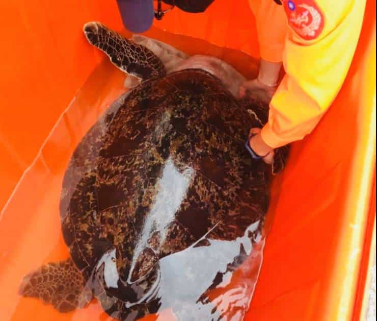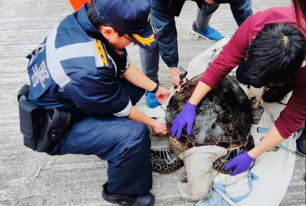 海巡署北部分署第一岸巡隊梗枋安檢所執勤人員於今(18)日上午11時接獲漁船通報一隻海龜誤闖定置漁網,隨即將海龜帶回安檢所保濕安置,並通報相關單位到場處理。完成記錄及植入晶片後,共同帶往大溪蜜月灣沙灘實施野放。