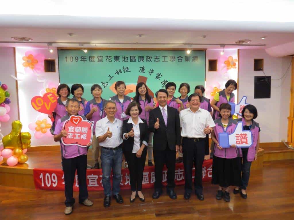 8月21日法務部廉政署為感謝廉政志工們的辛勞與增進志工服務效能,結合宜蘭縣政府辦理「109年度宜花東地區廉政志工聯合訓練」,邀請花蓮縣、臺東縣,及中央機關行政院農委會、臺東地方檢察署等廉政志工共襄盛舉,結合中央與地方資源跨域合作,擴大廉政志工的服務動能。