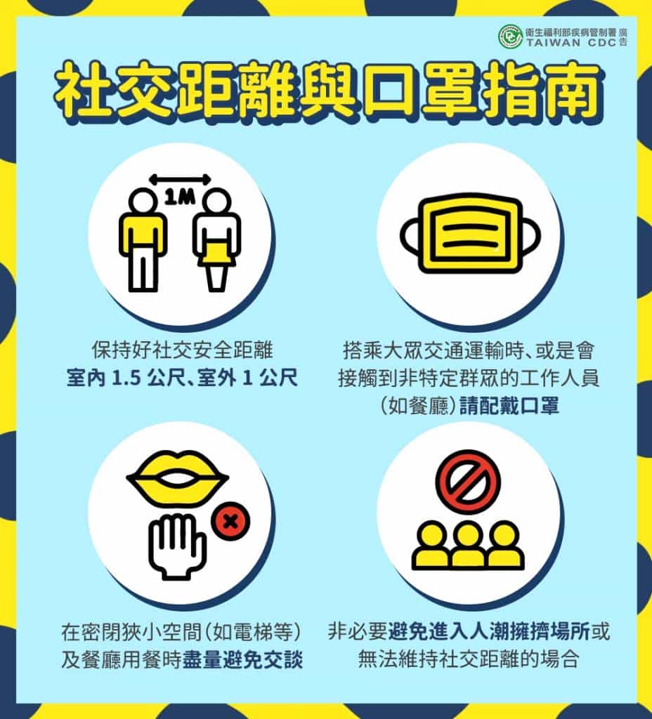 「防疫新生活運動」重點在於保持社交距離,室內保持1.5公尺、室外1公尺;若無法維持社交距離時,應戴口罩。業者亦可運用隔板將座位隔開,或採取梅花座保持適當的安全距離,出、入口及場所內提供乾(濕)洗手用品或設備;並採取實名制,以確實執行人流管制及環境的消毒。此外,民眾出入公共場所,無論室內室外,皆要量體溫,隨時保持手部清潔;如果出現發燒或呼吸道症狀,則應佩戴口罩,不要外出;如需就醫,不要搭乘大眾運輸工具。在疫情完全解除前,請民眾及業者都能遵循防疫新生活運動各項的指引,這樣我們的社區就能夠持續降低傳染的風險。