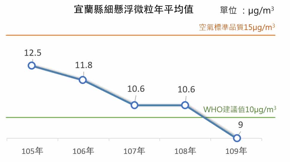 宜蘭縣政府環境保護局配合行政院環境保護署「空氣污染防制行動方案」,齊力推動空氣品質改善工作,近年空氣品質改善成果卓越,109年宜蘭縣細懸浮微粒手動監測年平均值為每立方米9.0微克,符合我國一般空氣品質標準年平均值每立方米15微克,亦首次達成WHO(世界衛生組織)建議值每立方米10微克,相較105年監測濃度改善率達29%,深獲環保署肯定,已連續4年獲頒最佳空氣品質改善「特優」之殊榮。