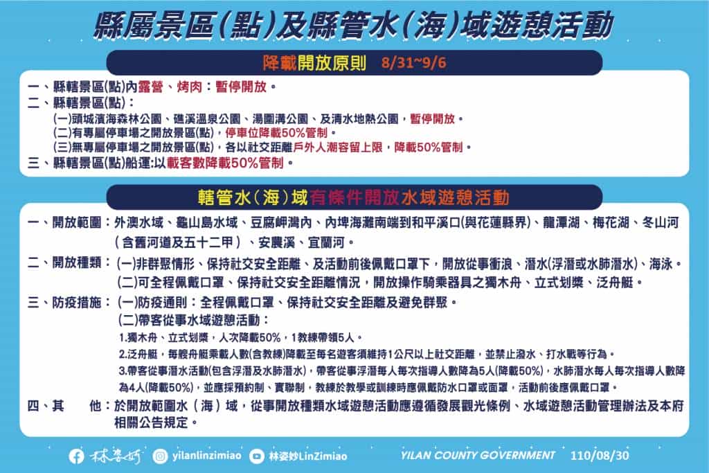 宜蘭縣自明(31)日起增加開放海泳、浮潛等水域活動 需落實防疫措施 Posted on2021-08-30Autor北台灣新聞網留下足跡 【北台灣新聞中心】 全國疫情趨緩,宜蘭已連續38添加零,中央也陸續鬆綁相關指引,宜蘭縣縣長林姿妙今天宣布,明天起宜蘭縣轄海域,於落實相關防疫措施前提下,增加開放海泳、浮潛等水域遊憩活動。 工旅處長李東儒指出,國內疫情持續穩定,中央流行疫情指揮中心也已開放海泳、浮潛等水域遊憩活動,縣轄海域自8/31起,增加開放海泳、浮潛等水域遊憩活動。其中,海泳於活動前後必須佩戴口罩;帶客浮潛,教練於教學或訓練時,應佩戴防水口罩或面罩,每人每次指導人數降為五人(降載50%),並落實實聯制及相關清潔消毒等防疫措施。 分享此文:FacebookTwitterPinterestPocket