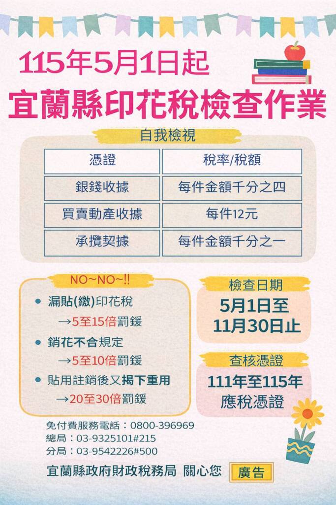 宜蘭縣政府財政稅務局表示,依印花稅檢查規則第3條規定,各稽徵機關每年應辦理印花稅重點檢查,本年度將於115年5月至11月展開檢查工作,該局提醒納稅人自行檢視最近5年內(111年至115年)應稅憑證及合約是否已依規定報繳印花稅,如有發現短、漏繳,自動補報繳並加計利息則可免予處罰,若被查獲漏繳印花稅,稽徵機關依法視漏繳稅額應裁處5至15倍罰鍰。