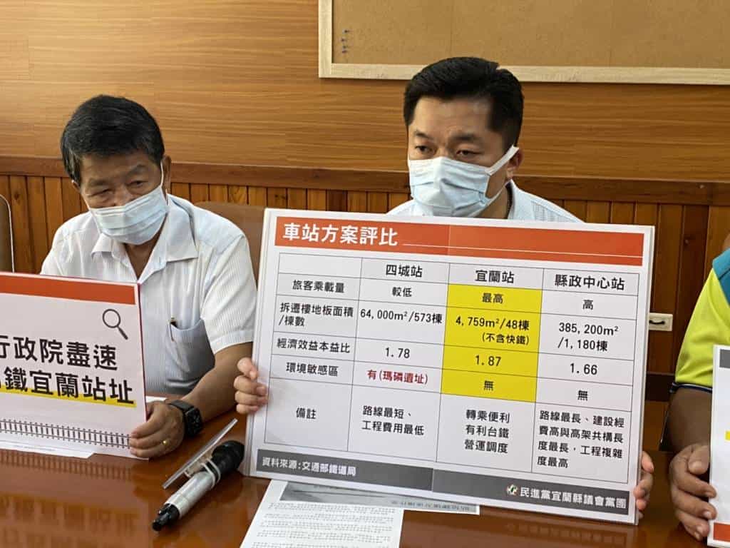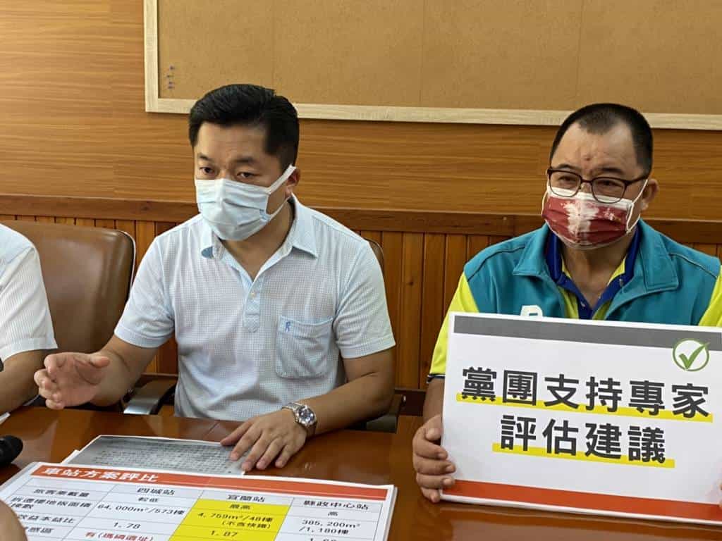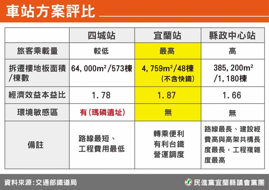 陳俊宇議員表示,根據交通部鐵道局花費7000多萬做的規劃報告,就旅客乘載量、沿線人口、就業與學術、環境敏感區、用地與房屋拆遷數量、經濟效益、開發效益、民眾轉乘便利性等因素評估,專家建議以「宜蘭站」為優先推動方案,四城及縣政中心站為替代方案。