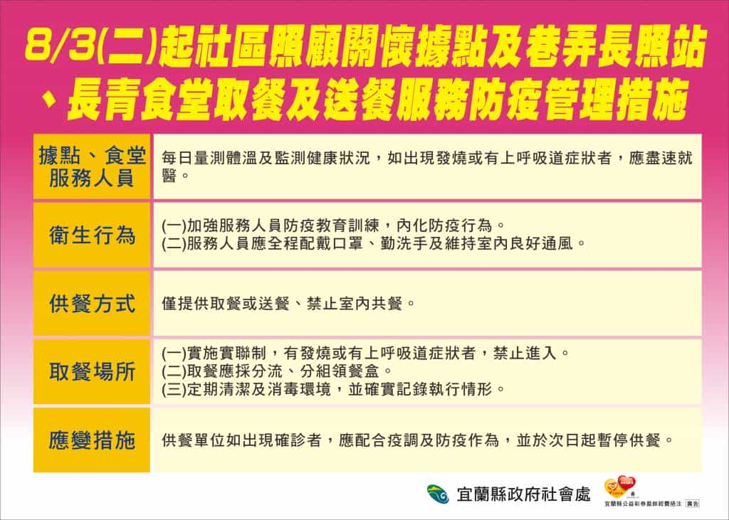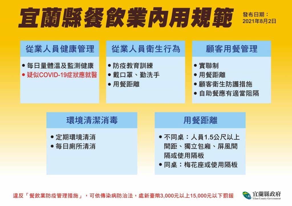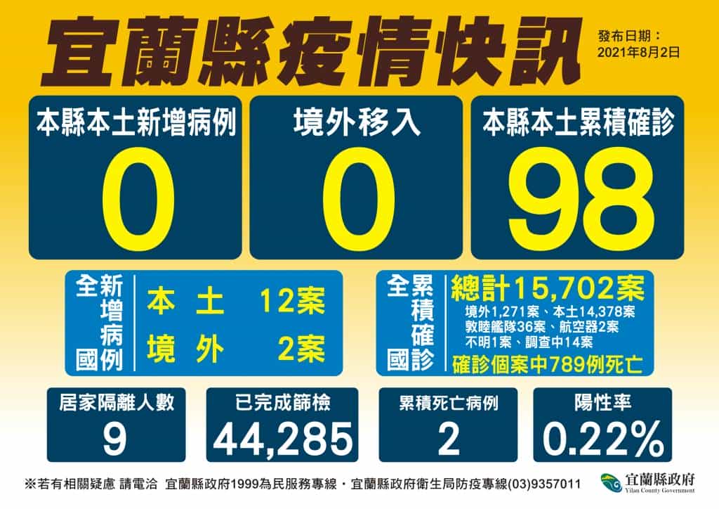 宜蘭今(2)日無新增個案。縣長林姿妙表示,宜蘭已連續10天「+0」,感謝縣民共同努力,讓宜蘭維持穩定的狀態。林縣長宣布,明(3)日開放餐飲業內用,請業者和民眾務必落實防疫規則,才能保護好自己和他人。