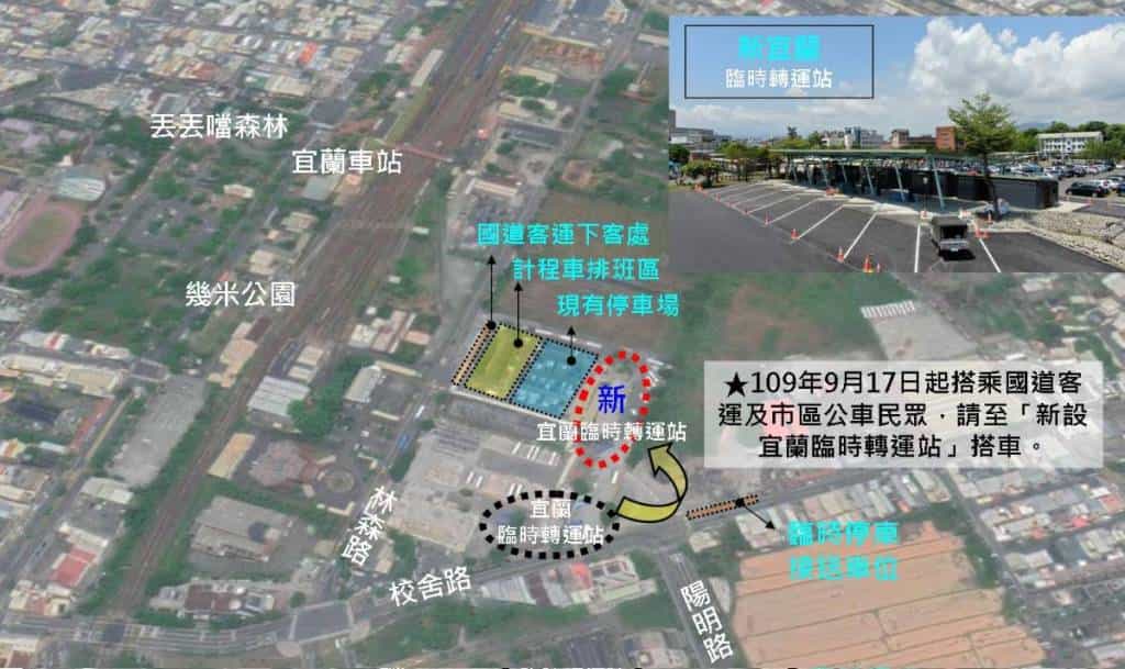 宜蘭縣政府為提供縣民及旅客更舒適轉乘空間,將於109年9月17日進行現有宜蘭臨時轉運站原地拆除及重建作業,並於同日啟用新設宜蘭臨時轉運站,請搭乘國道客運及市區公車之民眾,至「新設宜蘭臨時轉運站」搭車;接送家人、朋友的車輛,請於校舍路及林森路「臨時停車接送車位」等待接送,勿違規停車,影響交通秩序。